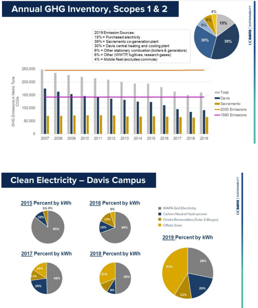 The campus’ webpage on its GHG reduction efforts is at https://sustainability.ucdavis.edu/goals/climate. This page includes the graphics below. As of 2019 total UCD emissions were below 2000 levels and approaching 1990 levels. This progress is great, but results mainly from improving on-campus efficiency and purchasing greener electricity (the latter shown by the Clean Electricity graphics). Heating and cooling emissions from burning methane remain high at both Davis and Sacramento campuses, and account for 69% of total UCD emissions. (Note: This chart looks a bit different from the graphic on the Background page because it combines Scope 1 & 2 emissions. The latter is just on-campus (Scope 1) emissions.
